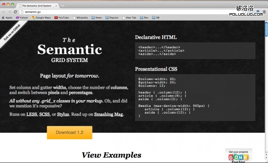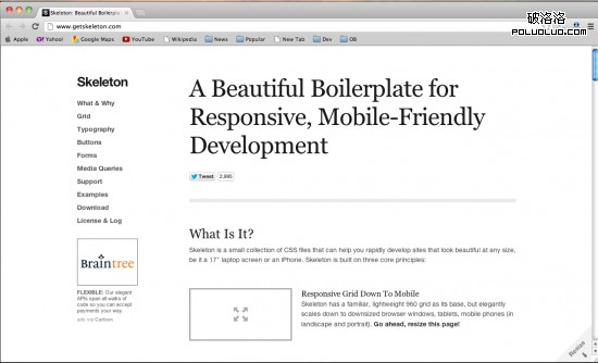 Skeleton是一系列CSS和JS文件的集合,它可以幫你快速地調整網頁在不同分辨率下的顯示效果,無論是17寸的筆記本電腦還是一個iPhone。Skeleton以輕量級的960網格系統為基礎,可以優雅地等比例縮放桌面、平板、手機上的浏覽尺寸。