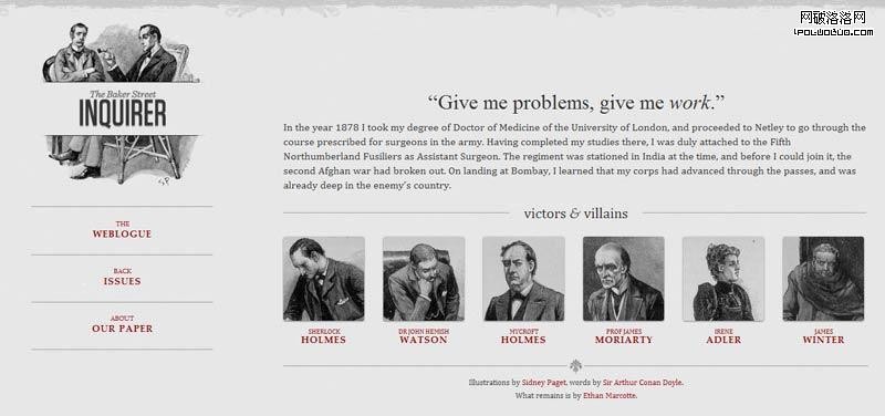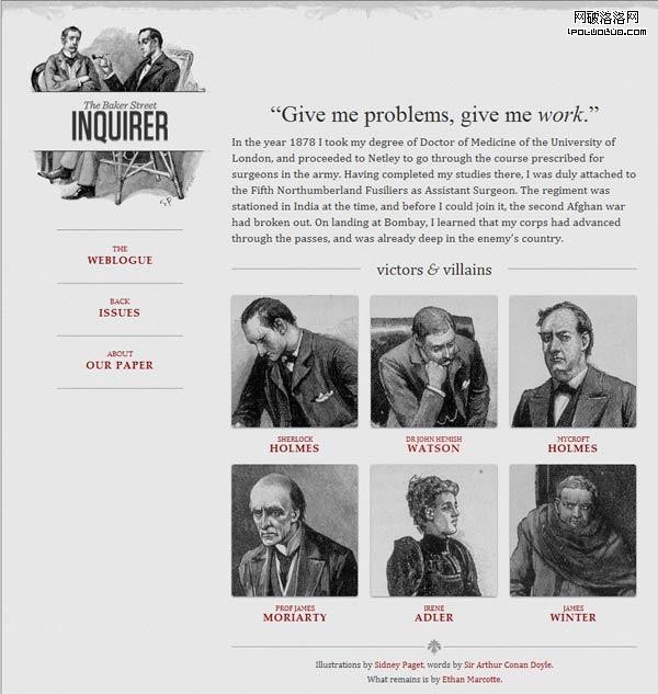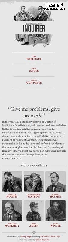 他制作了一個范例,裡面是《福爾摩斯歷險記》六個主人公的頭像。如果屏幕寬度大於1300像素,則6張圖片並排在一行。