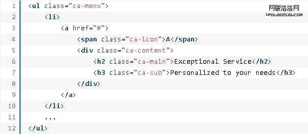 菜單的HTML架構是一個無序列表,其中的每個選項都是由圖標跨度和內容層組成的鏈接元素。內容層包含主標題和副標題: