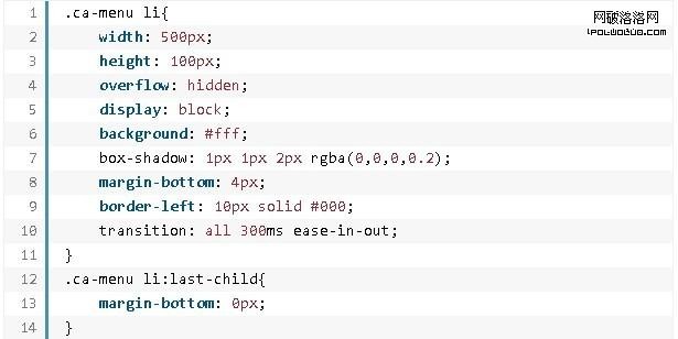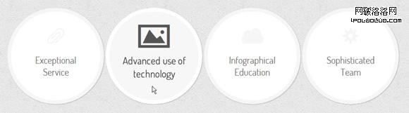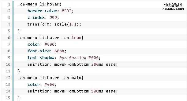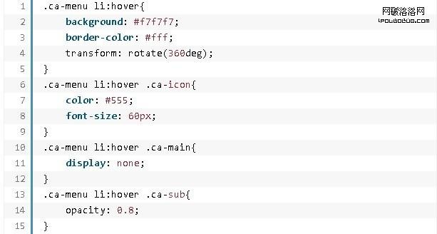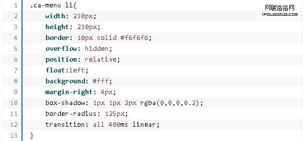 最後一個例子中,每個菜單項的左外邊距都是48像素,且相互重疊。當鼠標移上去時,環形菜單項整體變大,菜單的堆疊順序也上移(z-index是決定元素的堆疊順序)。最終就呈現出菜單項上浮的效果。