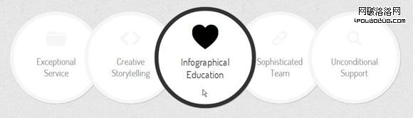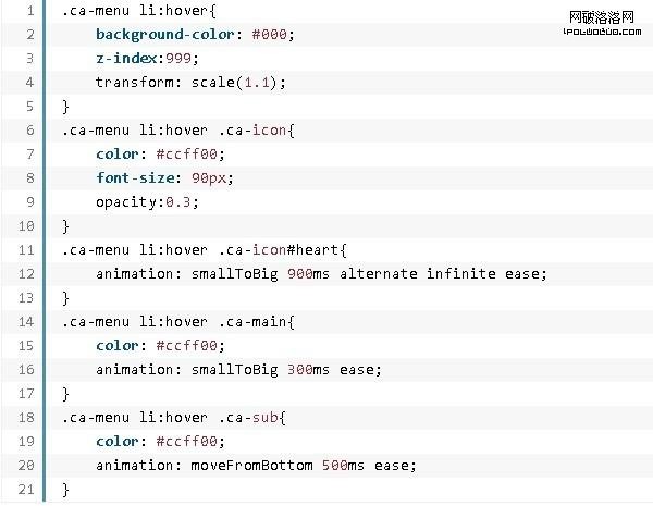 菜單中的心形圖標還有一個特殊的切換效果。當鼠標懸停時,通過運用由小變大和不斷循環交替的特殊方式來實現可愛的心跳動畫效果。