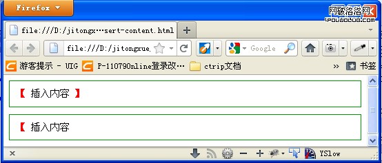 在css2中,我們使用:before來在元素的前面插入內容,使用:after在元素的後面插入內容(兼容浏覽器:firefox、chrome、safari、opera、ie8+)。請看下面的例子: