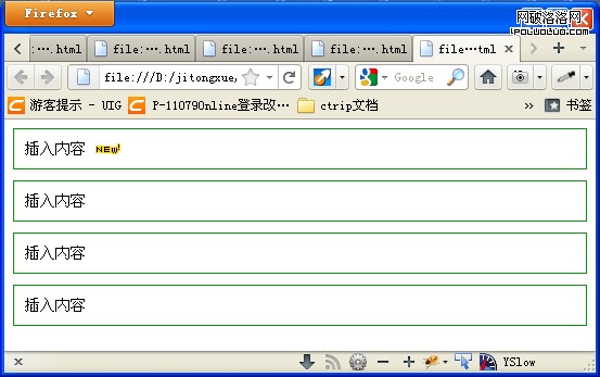 插入圖片,這是一個非常非常給力的功能,比如我有一個新聞列表,第一條新聞我想加個new的圖片或者說hot的圖片,以前我們或許通過程序來控制,但是現在,前端工作者也可以實現了,不需要程序員去寫判斷(這裡沒有使用li列表的形式,將就一下吧,寫demo的時候這樣寫了)。來看一下浏覽結果(ff3.6/4.0/7.0、chrome14、safari5、opera10.6):