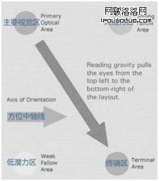 如圖所示,按照人們的視覺習慣,頁面分為幾個重要的區域,左上側為最佳視覺區,其次上右側,視覺重點呈圖中箭頭的方向減弱,web設計時就是根據這個原則進行頁面布局的。