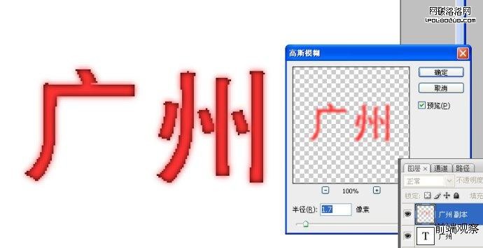下面是一個“廣州”的黑色純文本文字,然後我復制多一個圖層出來柵格化然後高斯模糊它,結果模糊層透過下面看到部分黑色純文本文字與上面的紅色半透明區域融合,視覺上有點內陰影的感覺。這個就是我實現 純css3內發光的原理:一個.text純文字層,一個.text:after層疊在上面投影產生內發光視覺錯覺,這個也就是為什麼要設置文字顏色透明的 原因,假如文字本身有顏色,那麼就會擋住半透明,這樣背景色就給擋住了,跟普通投影沒區別。不過這個方法有瑕疵,而且很致命,就是羽化多出邊界的會有羽化 的紅色,如果投影紅色換成白色,這樣跟背景融合,效果沒話說,但是如果用與底色區別太明顯的顏色,這樣就惡心了,不過可以調節成為“外發光”效果,事在人為。