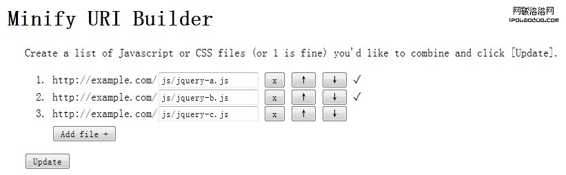假設網站域名是http://example.com,Minify安裝在了虛擬主機的根目錄下,那麼訪問http://example.com/min/,我們會看到一個“Minify URI Builder”,我們可以輸入需要進行合並的文件URI,如下