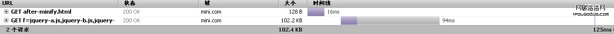下面兩幅圖分別是啟用Minify之前和啟用Minify之後網站請求時間的一個對比,可以看出啟用Minify之後,資源的加載時間從250ms減少到了125ms,總共節省了50%的時間。