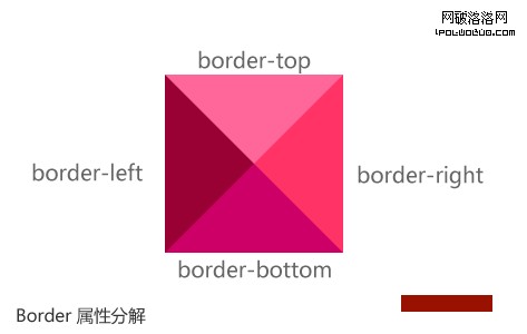 1 2 3 4 5 6 7 8 9 10 11 12 13 14 <!DOCTYPE html> <html> <head> <meta http-equiv="Content-Type" content="text/html; charset=utf-8" /> <style type="text/css"> <!-- #boder_arrow{border-width:20px;border-color:#ff6699 #ff3366 #cc0066 #990033;border-style:solid;width:0;height:0;line-height:0; } --> </style> </head> <body> <div id="boder_arrow"> </div> </body> </html>我們可以改變border不同方向的顏色來找到我們需要的顏色,我們甚至可以通過border-width的修改,創造不同角度的三角形.