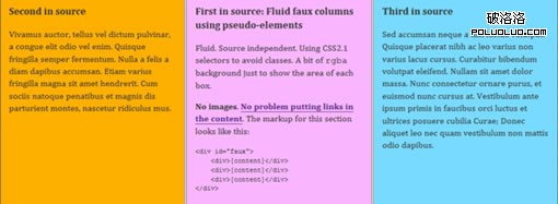 這篇文章我不知道是什麼時候有的,不過原文後面是對CSS3的屬性一些內容,我拋棄了,因為當時看到這篇文章主要是沖著使用CSS2.1的偽對象方式實現效果而去的。當我看到文章中提到用偽對象實現三列等高的時候,我表示十分驚訝,大概分析了一下這樣的等高處理方式也存在著一點點小問題,比如背景圖片定位(不支持偽對象的浏覽器不考慮在內了)。順帶說一下,曾經考慮過在偽對象的content屬性中增加圖片,但一直以為是不可能實現的,就沒嘗試了,現在看到了,我也明白了,凡事只有嘗試過後才能去確認!