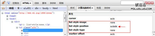 圖上可見,當css中定義list-style:none時,對list-style-position 並沒有影響,仍然是FF浏覽器的默認設置,值為outside