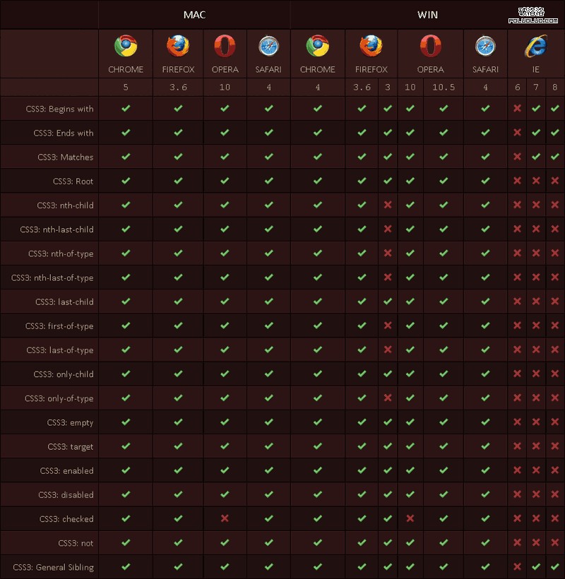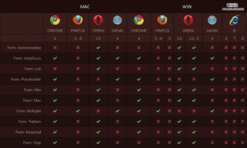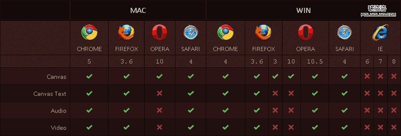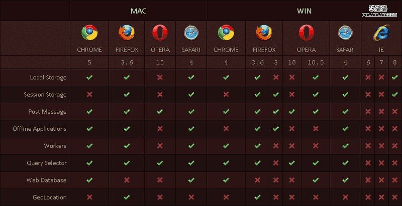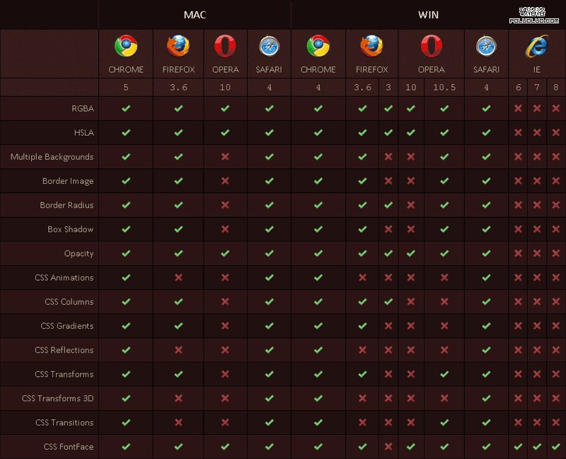需要指出的是,即使同一個浏覽器的同一個版本,在 Mac 和 Windows 兩個平台,它們對 CSS3 和 HTML5 的支持也並不一致。本文是一份 Chrome, Safari, Firefox, Opera, IE 5 大浏覽器,在 Mac 和 Windows 兩個平台,對 CSS3 和 HTML5 各種功能的詳細支持情況清單。