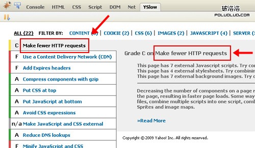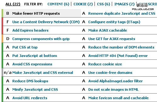 YSlow 顯示了 HTTP 請求數之外可以提升網站性能的因素
