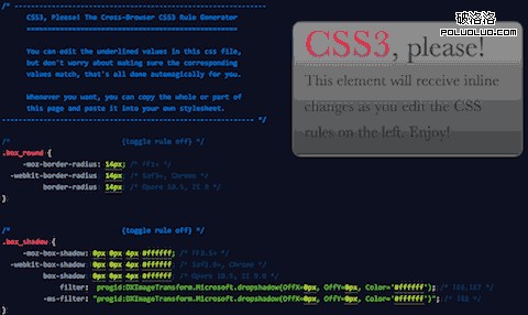 CSS3 Please一個在線生成跨浏覽器的CSS3代碼的網站,很直觀,也很方便,現在支持的CSS 3屬性有圓角、陰影、漸變、自定義字體、旋轉、rgba色彩。即將支持的還有其他的一些 css transform。