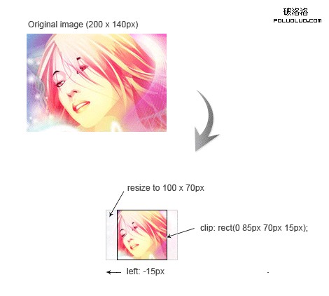 在這個示例中,我將展示如何調整圖像尺寸和剪輯圖片。素材圖片是矩形的,我想將其削減至 50% 的尺寸,用來創建一個正方形格式的縮略圖。因此,我用寬度和高度屬性來調整圖像,並使用 clip 剪輯屬性予以掩蓋。然後用 left 屬性將圖片移開左側 15px 的距離。