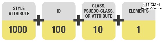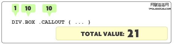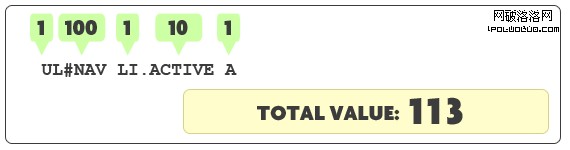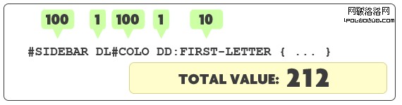 剛才為什麼我們第一次嘗試改變字體的大小和顏色失敗了呢? 隨著我們的學習,它是因為標簽自己簡單的運用類名,擁有較低的特性值,被其他的指向這個無序列表的具有ID值的選擇器“壓倒”。在那個句子中,重要的字眼是class和 ID。CSS不關心用class 和IDs做什麼,但是它卻給他們賦予不同的特定權重。事實上,一個ID擁有比一個class大10倍的特定權重。讓我們看看特定值是怎麼計算的: