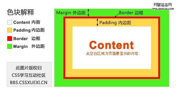 content(內容)、border(邊框)、padding(內邊距)、margin(外邊距),如下圖