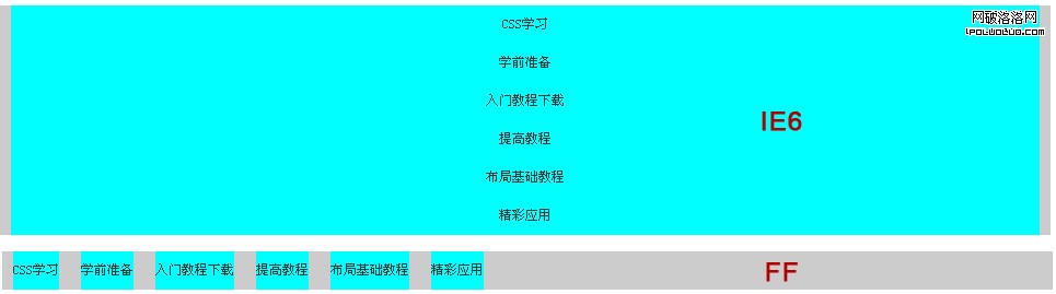 效果作出來了沒有,下面是在IE6和FF中顯示效果(其他浏覽器效果大家自己測試,總結規律):