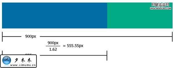 使用黃金分割是非常簡單的。比如你像找到你主要內容和sidebar列表的寬度。你將使用你內容區域總的寬度除以 1.62. 然後得到555.55px. 我們不需要那麼精確,所以我們就用555px。現在你就知道你的主要內容元素是555px的寬度,你的sidebar是345px。看看多麼容易?!