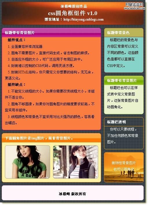 網頁制作poluoluo文章簡介:本來前三篇文章已經將CSS圓角框講解完畢,但從網友反饋中,都說到不好使用,因此有了這篇文章,本文主要是將前面的結果總結修訂後進行JS封裝,方便調用。