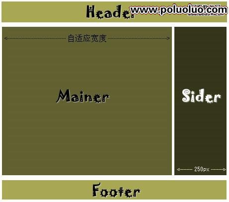 掌握了以上的方法,我們會發現制作一個三欄的布局也是很簡單的!OK。下面我們把上面的例子變下,我們需要一個三欄的布局,2側為固定寬度,中部為自適應寬度。這僅需要增加一點DIV。