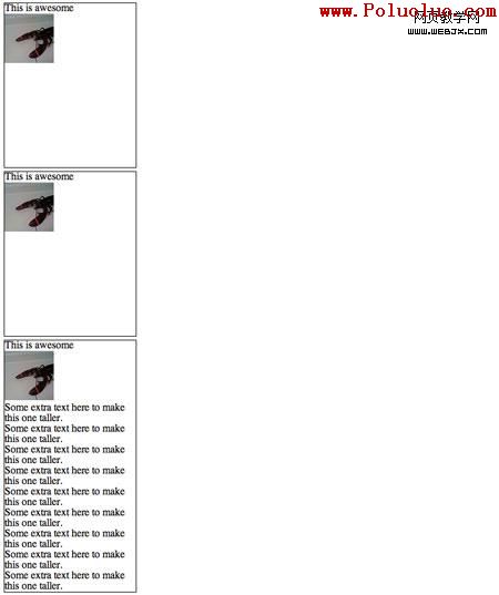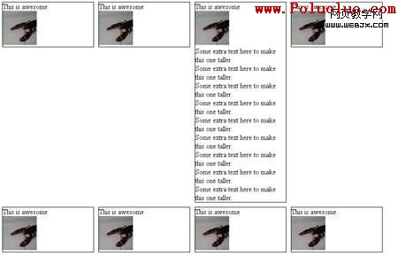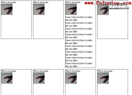 因為第一個展示項比其他項高,第五個項目就相對第一個浮動,而不是位於它下面了。基本上我們想要一個彈性表格的布局,但是適當的,語義標記。