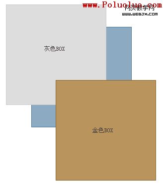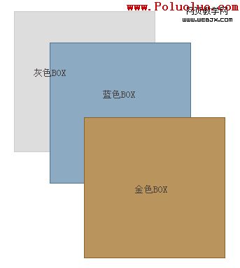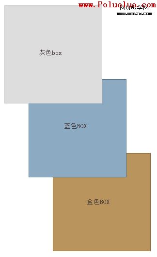 現在的結果是我們所期待的了:這些元素的層疊順序實現了反向;灰色的BOX覆蓋在藍色之上,藍色的覆蓋在金色之上。