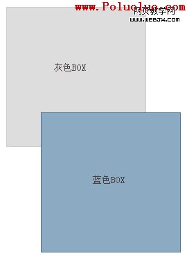 上面的BOX被定義了不同的背景和邊框色,並且後兩個是交錯的並且定義了負值的頂部邊距,所以我們可以看到自然的層疊順序。灰色的BOX在標記中位於第一位,藍色的BOX位於第二位,金色的排在第三。應用的負邊距明確的表明這個事實:這些元素未被設置Z-index 屬性;它們的層疊順序是自然的,或者是默認的,復合規則的。產生交錯的現象都是因為負值的邊距。