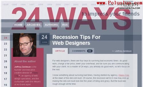 24 ways 這個網站以Z-index為工具來提升它的模板體驗,將年份和日期的長度、寬度延伸到和網站外層容器同等並相互交織,創造出了一個非常有趣的效果。