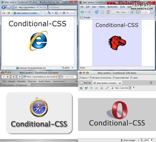 注意這個例子不適合部署在實際生產環境中,因為你只想在各浏覽器總保持一致的布局,而條件 CSS 只是用來修正 CSS 顯示 bug。但是這個例子確實給出了一個好的例子用來說明不同的 CSS 怎樣定位不同的浏覽器。