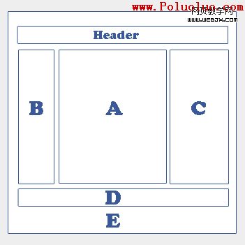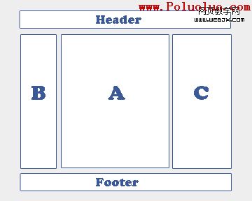 但是,我們常用的布局並沒有這麼簡單,除了三欄之外,我們還需要一個頁頭和一個頁腳,如下圖: