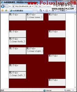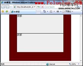 (2)為了更方便看到div的表現,筆者給內部div設置了淺灰色背景色和黑色邊框,而外部的div為深紅色背景色。在浏覽器地址欄輸入http://localhost/div_clear.htm,浏覽效果如圖11.10所示。