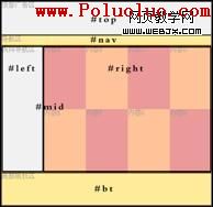 從分析圖可以看出整個頁面的結構,其中,#top代表廣告區、#nav代表導航區、#mid代表主體區、#left代表#mid所包含的左區域、#right代表#mid所包含的右邊區域、#bt代表版權信息區。