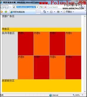 筆者稍微修改了XHTML部分的代碼,選了4個具體內容區加上了id名稱為content2的屬性,這是為了使這4個區域有不同的背景色。在浏覽器地址欄輸入http://localhost/ div_page.htm,浏覽效果如圖11.13所示。