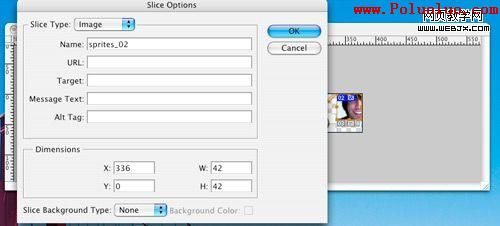 有了CSS Sprites,你將要用CSS選擇器對每個只顯示精靈中部分圖片的鏈接進行處理:只要你需要的那部分。你需要知道待顯示圖片的精確大小以及位置。這步用到Photoshop中的切片工具並選出你要用的那部分的圖。對新切片右鍵單擊,選擇編輯切片。在彈出的窗口會有圖片的分辨率和位置。