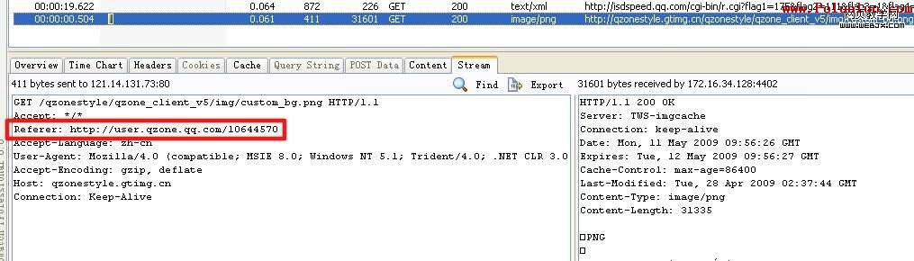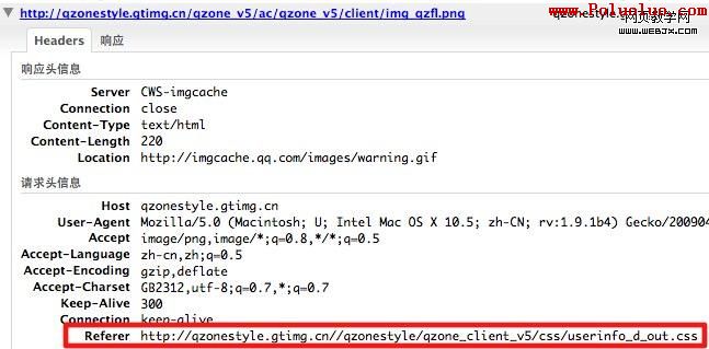 而我們的firefox卻會把圖片的referer來源更改為樣式文件的路徑,這樣如果我們在做一些防盜鏈處理的時候就需要格外小心.