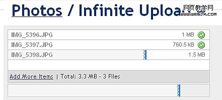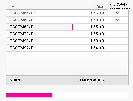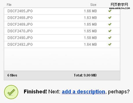 大部分領先的照片上傳采用的都是flash上傳工具,如上圖,這是在現有技術條件下實現功能跨平台浏覽器的最佳方案了,眾所周知,不同浏覽器對於 web代碼的解析都不同,Flash成為現今唯一一個跨平台的通用表現途徑。從交互設計上,這種上傳滿足了所有上傳所需要關注的關鍵字:文件名,文件大小,上傳進度提示。比較遺憾的是,並沒有提示具體的上傳速度和上傳時間,當用戶上傳的圖片數較多的時候,就會出現等待不耐煩的情況了。