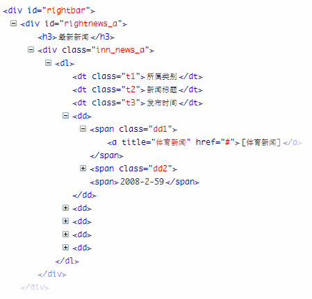 這幅圖就是 第二列 上半部分的頁面結構,這裡在新聞的部分我用了釋義列表(dl)來做,當然,你改成其它的結構我也沒什幺意見,其中dt是標題,有三個標題,所以這裡就是三個dt來代表了其中dd嵌套了三個span,因為沒有其它合適的標簽來表示這裡的結構,所以可以用span 。