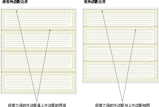 外邊距合並初看上去可能有點奇怪,但是實際上,它是有意義的。以由幾個段落組成的典型文本頁面為例。第一個段落上面的空間等於段落的上外邊距。如果沒有外邊距合並,後續所有段落之間的外邊距都將是相鄰上外邊距和下外邊距的和。這意味著段落之間的空間是頁面頂部的兩倍。如果發生外邊距合並,段落之間的上外邊距和下外邊距就合並在一起,這樣各處的距離就一致了。