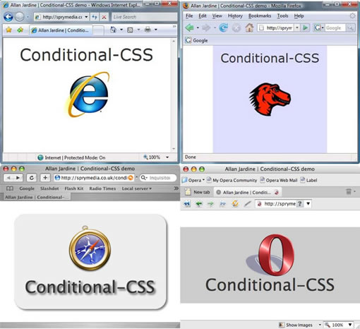 盡管條件 CSS 大多用於針對不同版本的 IE 浏覽器,當你在別的浏覽器碰到很難修正的 bug(主要使用 Javascript 修正) 的時候,條件 CSS 也是相當有用的。例子包括了缺少 ‘display: inline-block’ 支持的 Firefox 2 和 Safari 2 中的 背景圖片 bug。這些 bug 在這些浏覽器的最新版本裡面已經修正了,但是當這些浏覽器占有一定市場份額的時候,向後兼容就很重要了。