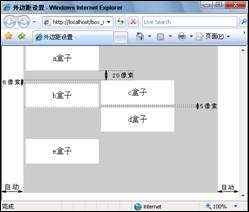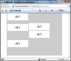 — 說明:讀者可以嘗試把b盒子的頂部邊距設置為5像素,這時b盒子和c盒子高度一致。d盒子無法“流”上來,d盒子將自動換行,位於b盒子下面。