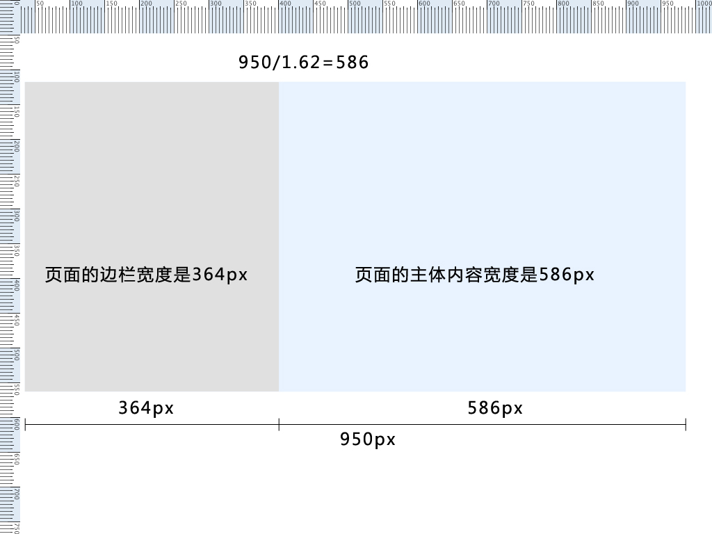 在超越CSS這本書中,就提到了網頁設計中的黃金比例這個概念。對於很多做設計的人來說,黃金比例並不陌生,它是最符合自然界美感的一個很神奇的東西,在古希臘的藝術雕塑中頻頻體現出來。對於我們網頁設計師來說,只要記住一個數字就可以了:“1.62”,以950局中的頁面為例: