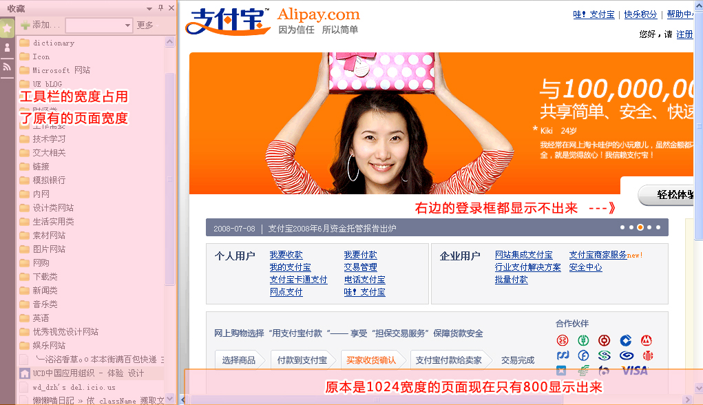 現在的頁面布局一般都是比較彈性的設計,因為這樣頁面可以充滿浏覽者的屏幕空間,而不管視窗的大小尺寸是多少,這對於那些高分辨率寬屏的用戶來說是有意義的。而對於堅持固定像素寬度的設計者來說,1024*768就是王道,摒棄了兩端的使用人群。在超越css這本書中還提到,即使是固定寬度的設計,減掉浏覽器的滾動條寬度和浏覽者打開了工具欄的寬度之後,水平寬度就顯得不夠用了: