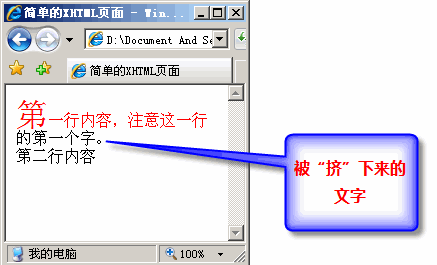 圖:被“擠”下來的文字,將失去偽對象“:first-line”設置的樣式