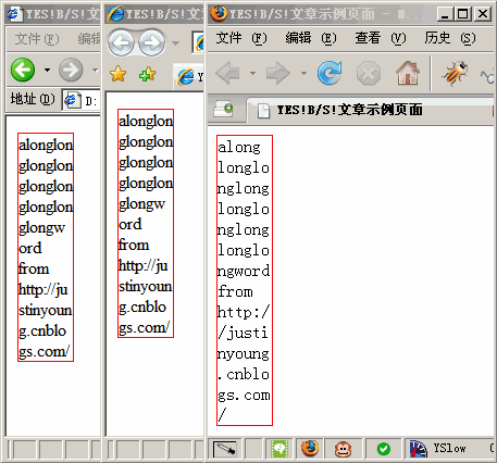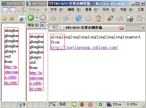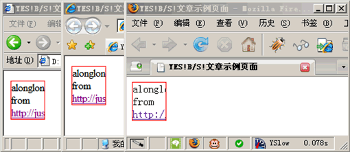 顯然,用“word-wrap: break-word”又導致了IE(IE6和IE7)和FireFox的顯示結果新的不一致。那還有沒有其他的辦法呢?“擒賊先擒王”,既然是“overflow: visible”導致的bug,那直接改變“overflow”的值不就可以了嗎?所以,使用“overflow: hidden”便能讓IE6、IE7和FireFox顯示一直。下面的這個示例,可能會有助於你的理解: