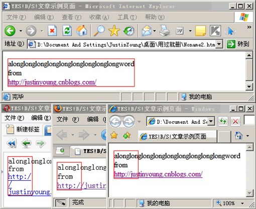導致布局混亂的主要原因,是IE6對overflow的visible的錯誤解釋,才導致寬度被“撐開”才造成的。所以,我們必須采取措施,讓IE6中容器不能那麼“放縱孩子”才可以。方法就是使用“word-wrap: break-word”樣式(IE特有,FireFox不起任何作用),強制要求容器內的內容不允許“撐開”父容器。下面的示例可能有助於理解。