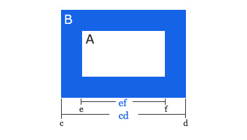 如上圖所示, 對象A(白色矩形)周圍有藍色邊框B, 可以看出A的實際寬度為ef, 而IE5不這麼認為, 它把cd的長度定義為對象A的寬度, 這個bug在邊框的寬度小時幾乎察覺不到, 但在邊框與對象寬度相差不大時顯得尤為明顯.