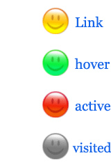 好在css還是留了一手, 那就是鏈接的偽類選擇器, 所謂偽類就是指依賴於浏覽器或是用戶的狀態. 對於鏈接來講, 存在link, hover, visited, active四種狀態, 即四種偽類選擇器: a:link(存在鏈接, 但無鼠標動作), a:visited(被點擊或訪問過), a:hover(鼠標懸停於鏈接上時的狀態), a:active(鼠標點擊與釋放之間的狀態).