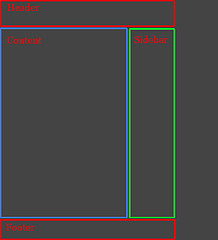 一定要先橫再豎,即先把你的網頁分為top,mid,bottom三個部分,然後再把mid分為content和sidebar兩個部分。對於單欄樣式,只需要兩橫刀,而對於三欄樣式,可能就需要兩橫兩豎刀。