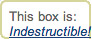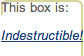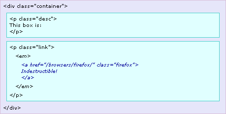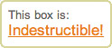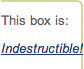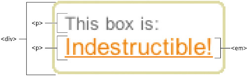 一個作為容器的<div>和緊隨其後的一個段落對象將作為前兩個載體。要湊足四個,我們將鏈接“Indestructible!" 用第二個段落對象以及(這裡引入了一個有爭議的額外HTML對象)一個<em>對象包圍起來。這裡我使用<em>是因為,從技術角度來講,我也打算讓它個鏈接表達一種強調的意思。