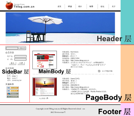 下面,我們需要根據構思圖來規劃一下頁面的布局,仔細分析一下該圖,我們不難發現,圖片大致分為以下幾個部分: